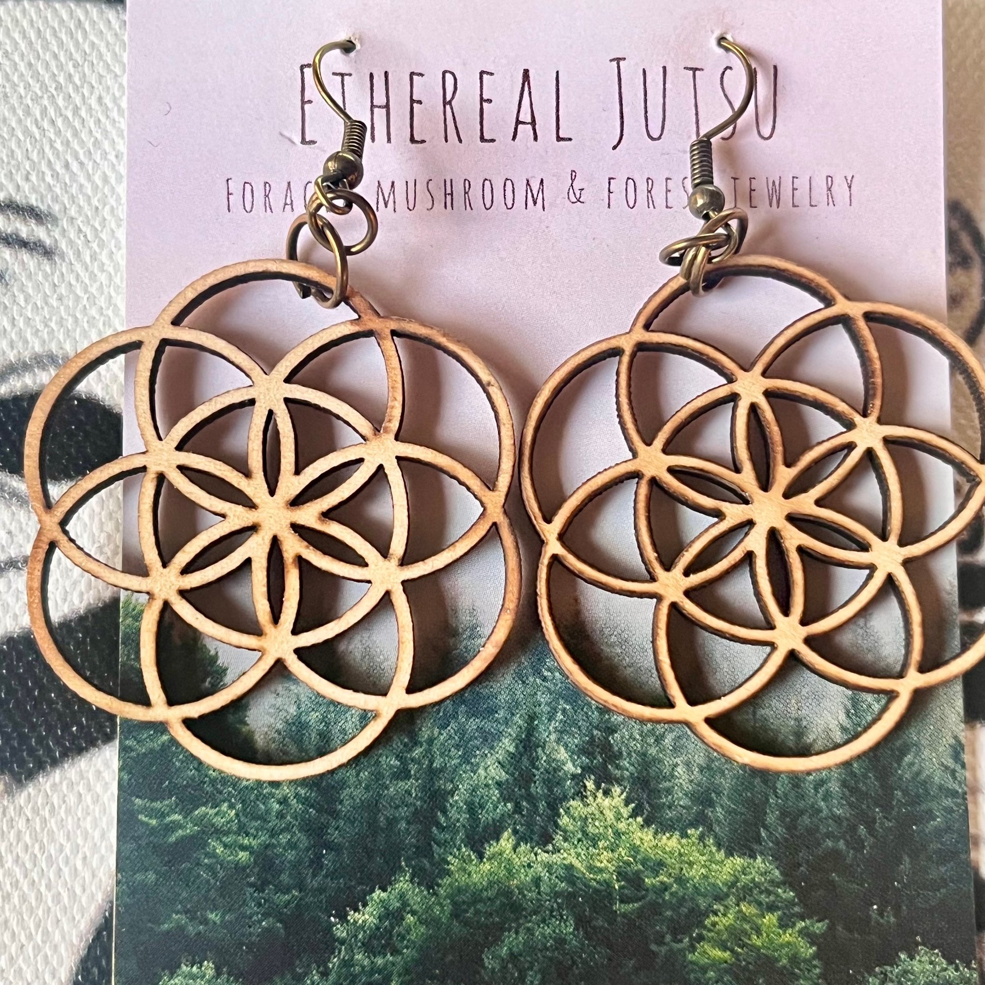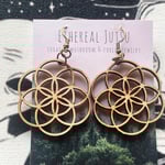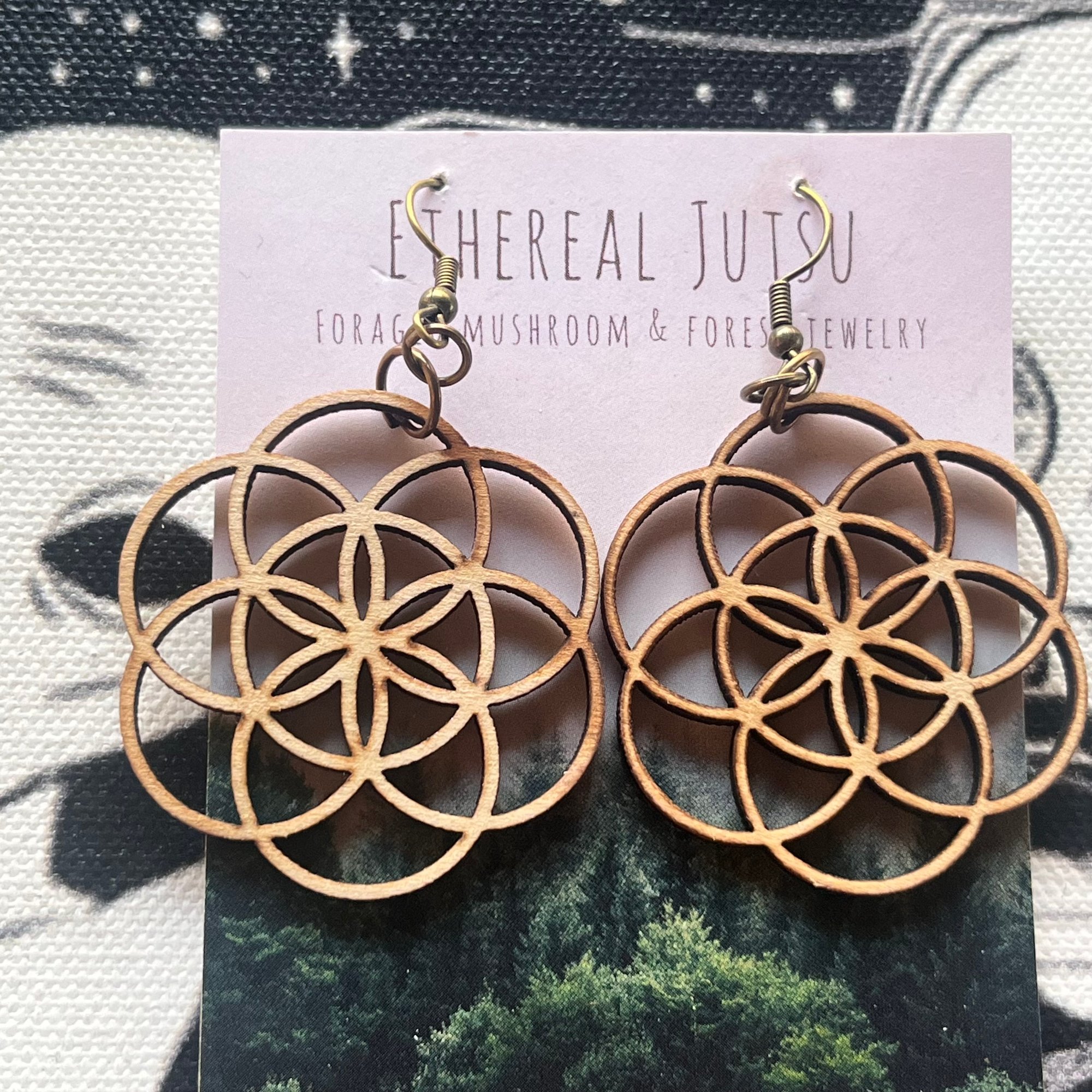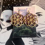 Carved from warm, natural wood and suspended on elegant brass hooks, these earrings carry the ancient resonance of the Flower of Life—a sacred geometric pattern found across cultures and centuries, from Egyptian temples to Tibetan mandalas.