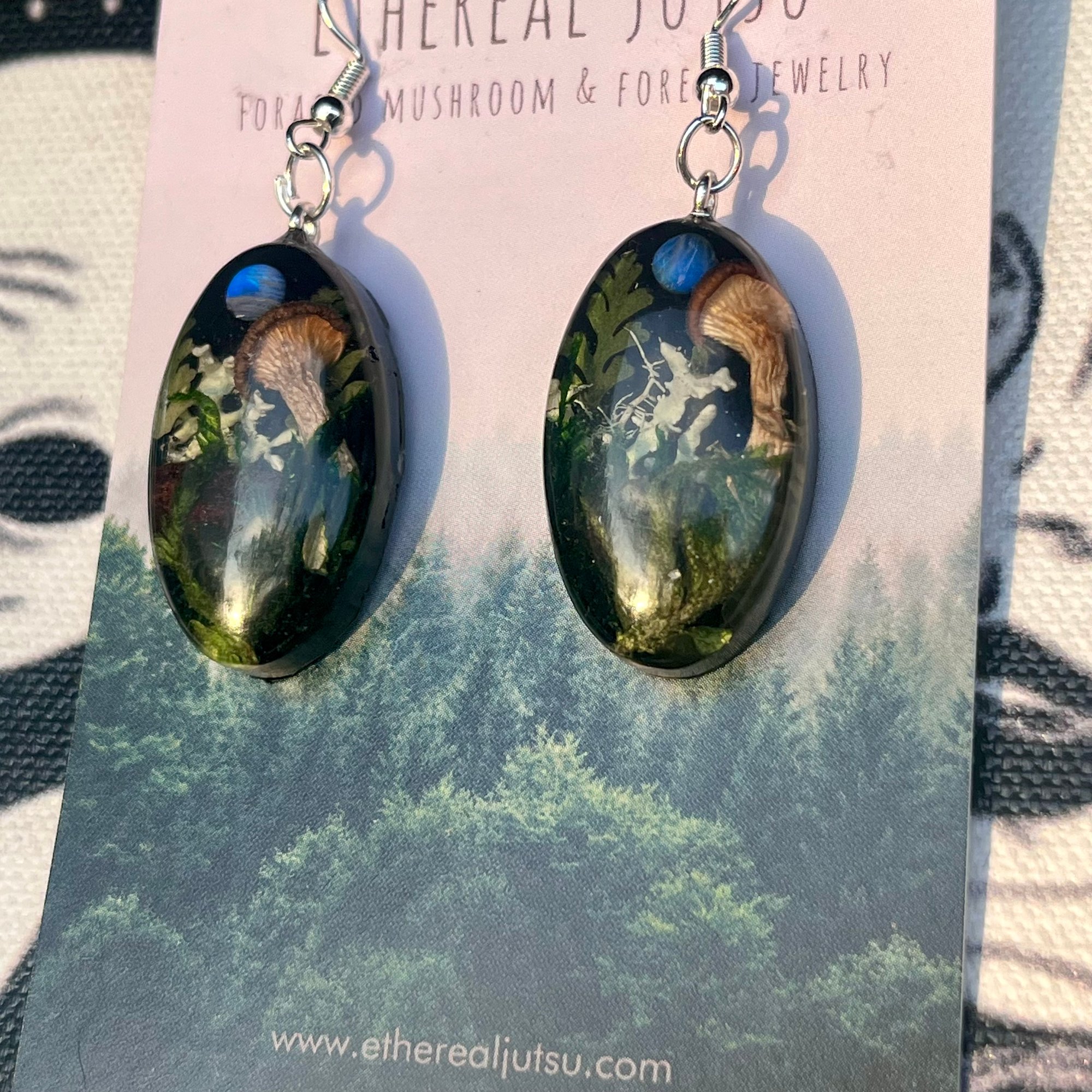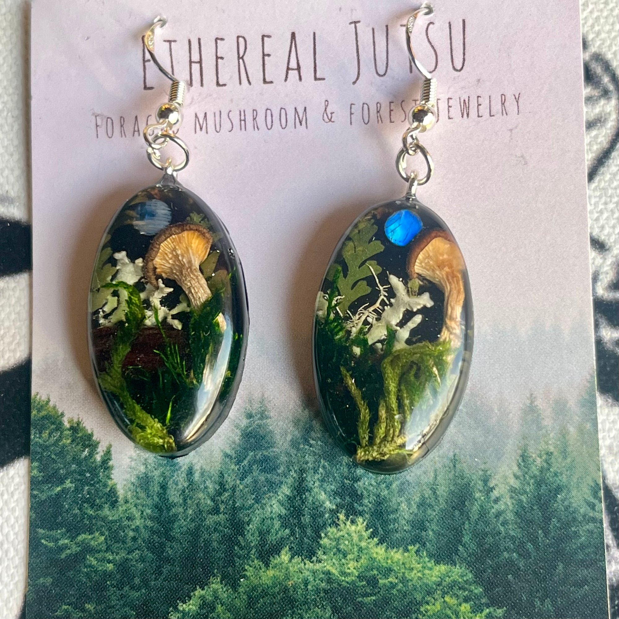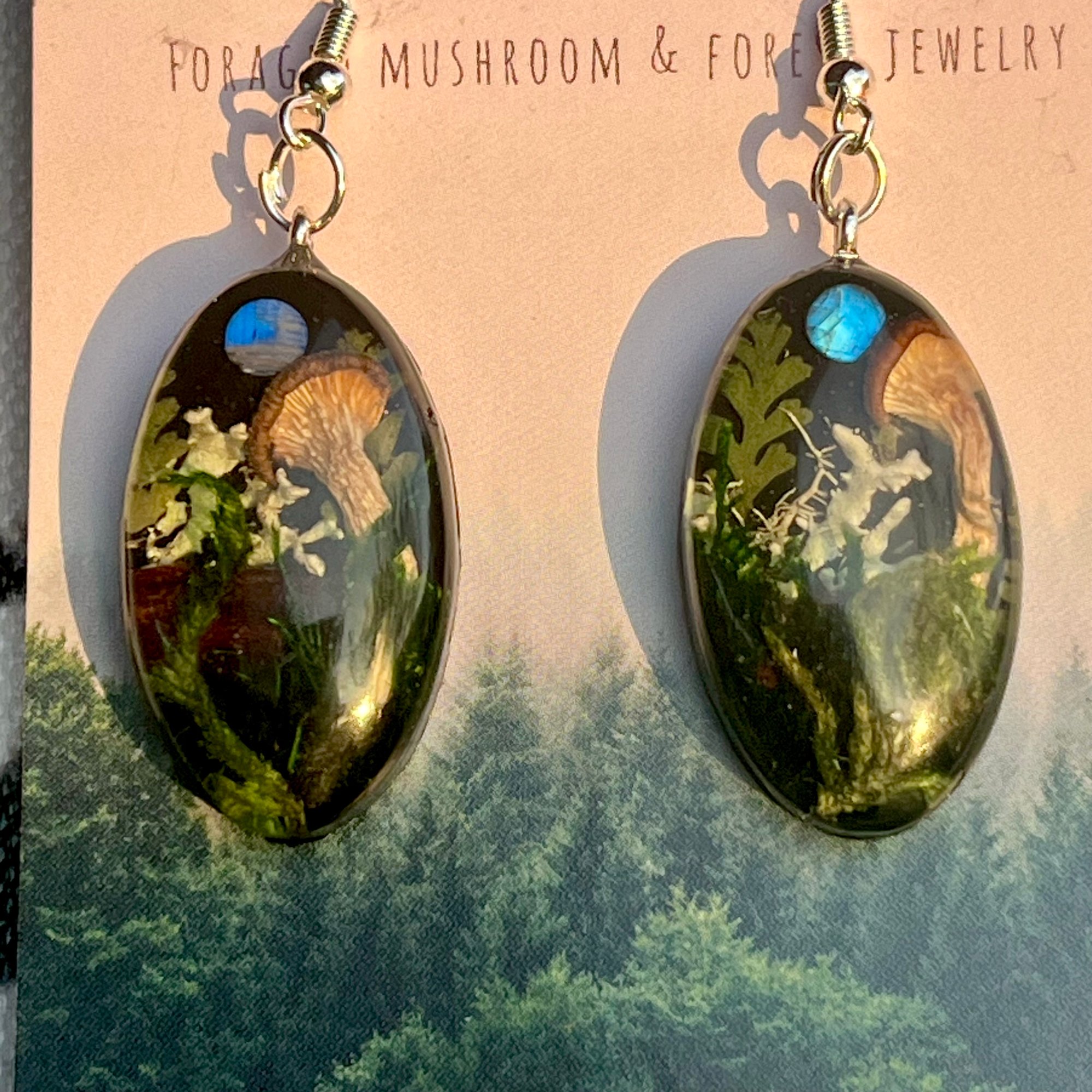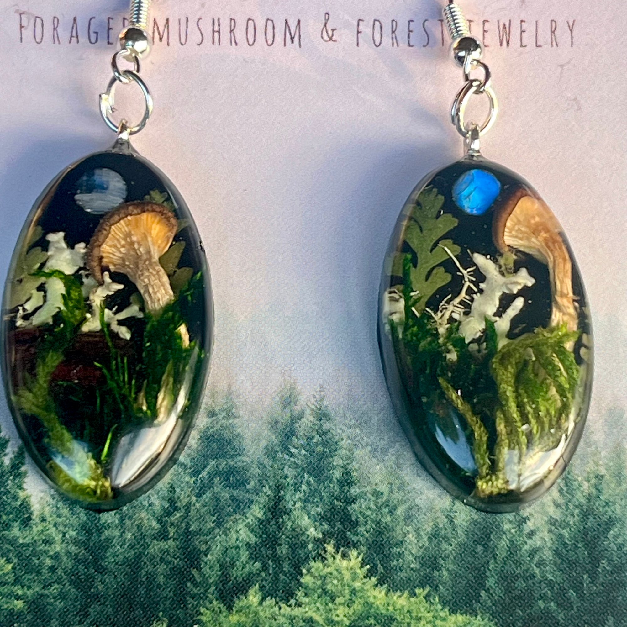Step into the twilight of an enchanted forest with these one-of-a-kind earrings, featuring homegrown mushrooms emerging from a mossy woodland scene. Set against a deep black backdrop like nightfall in the trees, each earring holds a glowing 3mm rainbow moonstone—flashing with ethereal blue light, symbolic of twin moons rising through shadow.