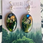 Nestled below are preserved moss, lichen, redwood, and fern leaves—each carefully arranged to honor the sacred balance of life, decay, and rebirth. Sealed in crystal-clear jeweler’s grade epoxy resin, these earrings serve as tiny altars of Earth magic, grounding your spirit while attuning you to lunar wisdom.